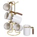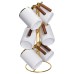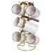 Набір із шести чашок призначений для подачі гарячих напоїв у колі сім’ї чи гостей. Чашки виготовлені з кераміки та мають витончений золотистий обідок, що додає їм елегантного вигляду. Вони зручно розташовуються на металевій підставці золотистого кольору, яка допомагає заощадити місце та підтримувати порядок на кухні. Основні характеристики набору чашок на металевій підставці Об'єм чашки: 400 мл; Верхній діаметр чашки: 8 см; Нижній діаметр чашки: 6 см; Висота чашки: 10 см; Діаметр підставки: 15 см; Висота підставки: 39 см; Матеріал чашок: скло + бамбук; Матеріал підставки: метал. Металева підставка має стійку конструкцію та гачки для підвішування чашок, що забезпечує легкий доступ до них. Завдяки оптимальному об’єму кожна чашка підходить для подачі чаю, кави чи інших гарячих напоїв. Гладка поверхня кераміки легко миється, зберігаючи первинний вигляд навіть при регулярному використанні. Такий набір зручний для щоденного користування та підходить для подачі напоїв як у домашніх умовах, так і під час святкових заходів. Компактне розміщення на підставці дозволяє завжди мати чашки під рукою та зберігати їх у належному вигляді.