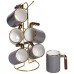 Набір із шести чашок призначений для подачі гарячих напоїв у колі сім’ї чи гостей. Чашки виготовлені з кераміки та мають витончений золотистий обідок, що додає їм елегантного вигляду. Вони зручно розташовуються на металевій підставці золотистого кольору, яка допомагає заощадити місце та підтримувати порядок на кухні. Основні характеристики набору чашок на металевій підставці Об'єм чашки: 400 мл; Верхній діаметр чашки: 8 см; Нижній діаметр чашки: 6 см; Висота чашки: 10 см; Діаметр підставки: 15 см; Висота підставки: 39 см; Матеріал чашок: скло + бамбук; Матеріал підставки: метал. Металева підставка має стійку конструкцію та гачки для підвішування чашок, що забезпечує легкий доступ до них. Завдяки оптимальному об’єму кожна чашка підходить для подачі чаю, кави чи інших гарячих напоїв. Гладка поверхня кераміки легко миється, зберігаючи первинний вигляд навіть при регулярному використанні. Такий набір зручний для щоденного користування та підходить для подачі напоїв як у домашніх умовах, так і під час святкових заходів. Компактне розміщення на підставці дозволяє завжди мати чашки під рукою та зберігати їх у належному вигляді.