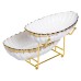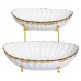 Двухъярусная фруктовница предназначена для сервировки и удобной подачи фруктов, сладостей или закусок. Она состоит из двух керамических тарелок белого цвета с изящным золотистым ободком, расположенных на разных уровнях. Такая конструкция позволяет разместить большее количество продуктов, экономя место на столе. Металлическая подставка золотистого цвета обеспечивает устойчивость фруктовницы и придает изысканный вид. Между ярусами есть достаточное пространство для удобного размещения фруктов среднего и большого размера. Гладкая поверхность тарелок легко моется и устойчива к царапинам, что делает практичным в повседневной жизни и на праздничном столе. Основные характеристики фруктовницы: Размер: 29×25×20 см; Материал: порцеляна; Материал подставки: металл; Длина: 29 см, 24 см; Ширина: 15 см, 13 см; Объем: 1.8 л, 0.6л. Благодаря продуманному дизайну фруктовница подходит как для домашнего использования, так и для сервировки во время приемов или банкетов. Она сочетает эстетичность и функциональность, обеспечивая эффектную подачу блюд.