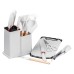 Набір у білому кольорі включає 19 предметів, серед яких кухонні ножі, ножиці, різалку та зручну подставку. Всі прилади можна мити в посудомийній машині та використовувати з посудою з антипригарним покриттям. Вони також легко миються вручну завдяки своїй литій конструкції без швів, які можуть накопичувати залишки їжі.