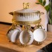 Суповий сервіз із високоякісної порцеляни стане прикрасою будь-якого столу та додасть сервіруванню нотку вишуканості. Елегантне поєднання білого кольору із золотими та чорними акцентами робить набір особливо ошатним і сучасним. До комплекту входить супниця з кришкою та шість супових тарілок, на міцній металевій підставці із золотим покриттям. Завдяки зручній формі та продуманому дизайну сервіз не тільки красивий, але й практичний у використанні. Основні характеристики супового сервізу: Матеріал: порцеляна + метал; Розмір: 25×25×33 см; Обсяг супиці: 2 літри; Об'єм тарілок: 400 мл; Діаметр супниці: 22 см. Діаметр тарілок: 11см. Такий набір прекрасно підійде для сімейних обідів, святкових вечер або урочистих заходів. Він стане чудовим подарунком на весілля, новосілля або ювілей, підкреслюючи смак і увагу до деталей господарів будинку.