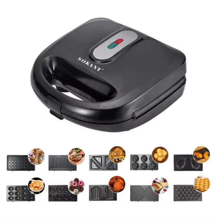 Мультипекар 10 в 1 Sokany SK-08021-10 ідеально підходить для готування сендвічів, вафель, орішків, маффінів, пончиків та інших страв. Зручні індикатори роботи і готовності дозволять контролювати процес приготування. Антипригарне покриття панелей запобігає залипанню їжі, а зняття і очищення їх буде легким і швидким.