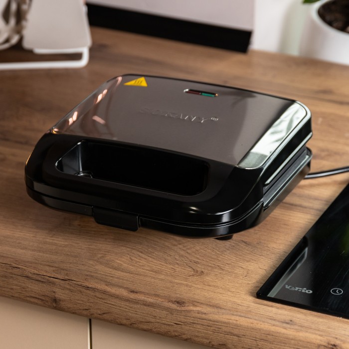 Ідеально підходить для швидкого приготування сніданків та вечерь, оскільки він має два індикатори - для нагріву та готовності. Висока потужність дозволяє швидко та рівномірно нагрівати прилад, що заощаджує час. Антипригарне покриття панелей запобігає пригорання їжі та легко миється.